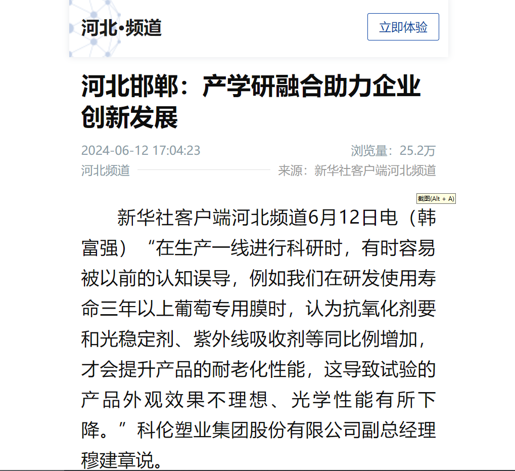 科倫塑業集團股份有限公司于2024612日就公司成長歷程、產學研融合助力企業創新發展方面,公司副總經理穆建章接受新華社河北分社采訪,報道詳情如下